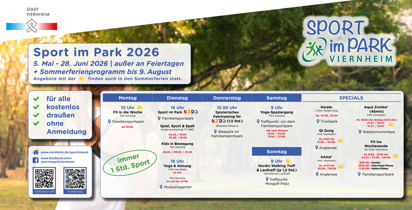 Wenn die Tage länger werden und sich das Leben wieder verstärkt nach draußen verlagert, wächst auch die Lust auf Bewegung an der frischen Luft. Genau hier setzt „Sport im Park“ an: Vom 5. Mai bis 9. August 2026 verwandeln sich zahlreiche Orte im Viernheimer Stadtgebiet erneut in offene Bewegungsräume für alle. Gemeinsam mit Viernheimer Sportvereinen und der städtischen Volkshochschule Viernheim (VHS) lädt die Stadt Viernheim dazu ein, unter freiem Himmel sportlich aktiv zu werden – wie gewohnt kostenlos, unverbindlich und ohne Anmeldung. Das Motto bleibt: einfach vorbeikommen und mitmachen.